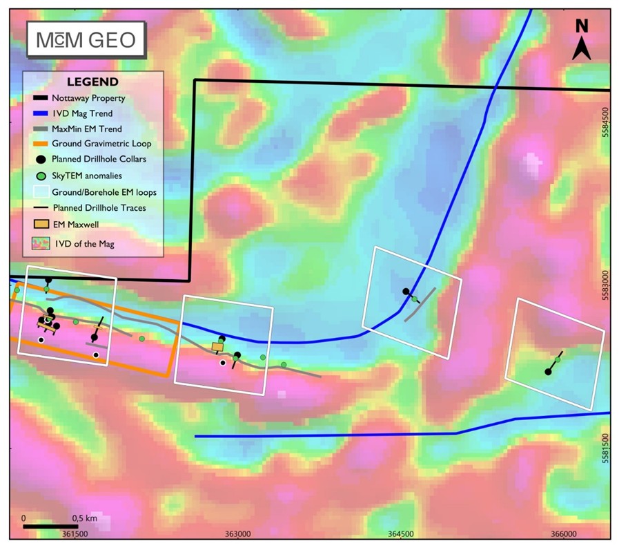 - In und im Umfeld des Nottaway Shear Corridor gibt es nach wie vor mehrere unerprobte elektromagnetische (EM) Leiter, was ein bedeutendes unerschlossenes Potenzial für die Auffindung einer Mineralisierung im Zusammenhang mit Massivsulfiden erkennen lässt.